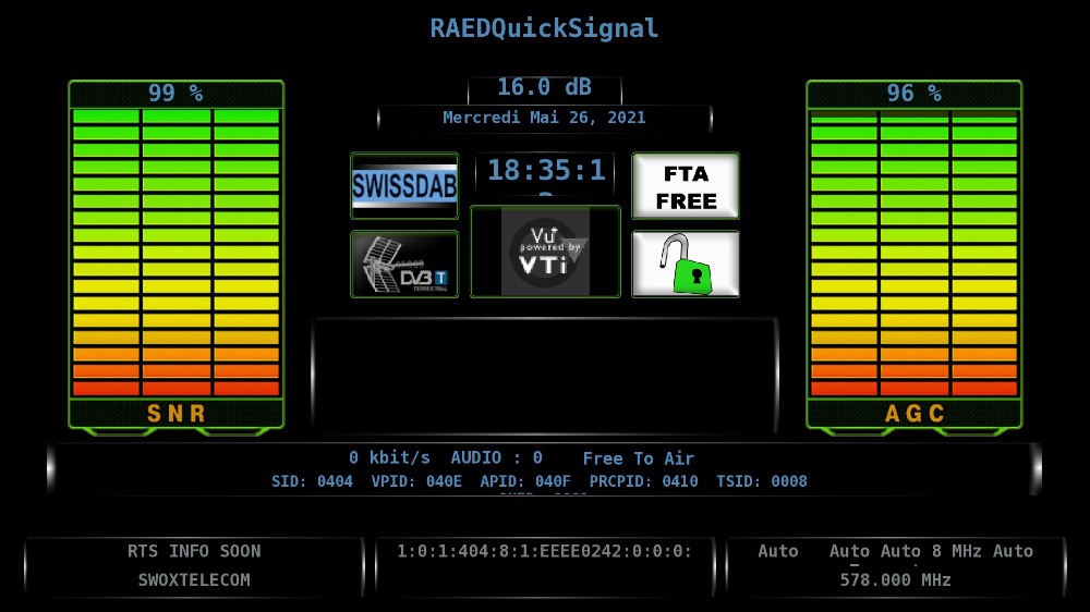 Concernant la réception des programmes de SWOXTELECOM (Dôle et Chasseral): Je ne vois les chaînes en HEVC (H.265) qu'avec le récepteur Technisat DIGIT ISIO STC listé ci-dessus. Sur une Dreambox DM920, les canaux HEVC sont uniquement affichés avec un écran noir sans audio et sur un Technisat DIGIPAL DAB + (DVB-T2 HD / DAB +) avec une image fixe avec audio.