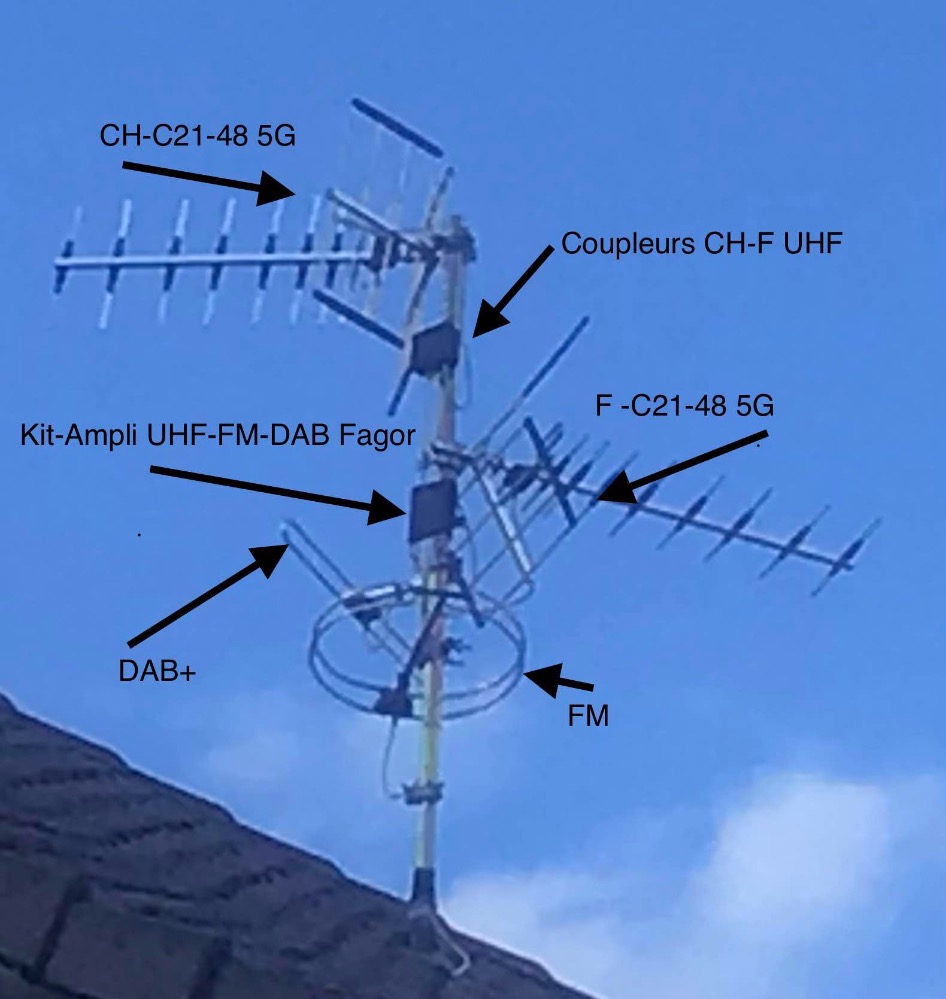 Je n'ai pas indiqué la distribution interne une entrée 2 sorties donc sur la photo il y a l'ampli d'antenne avant la descente sur la distribution .